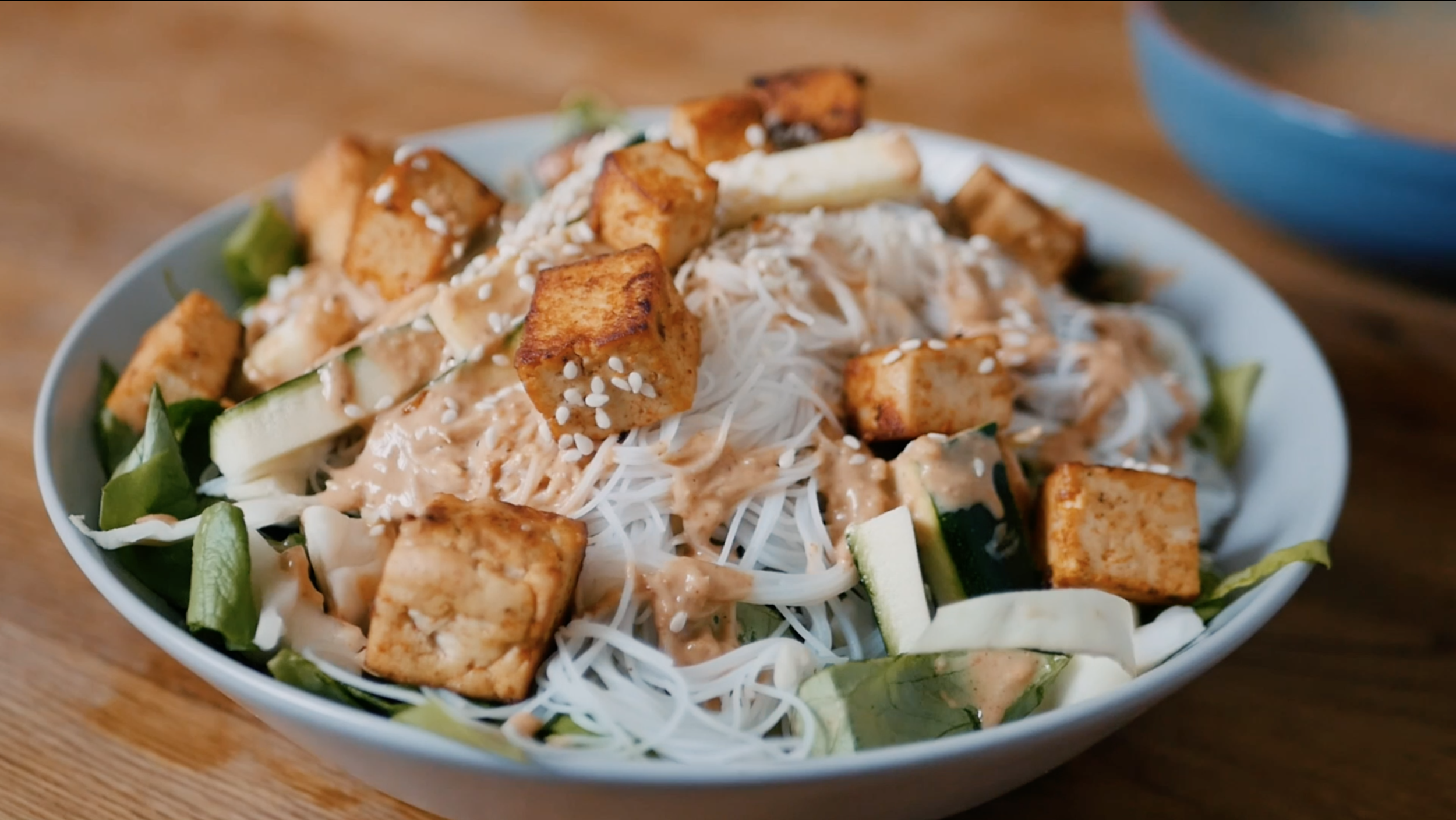 Fry your marinated tofu in a pan for 3-5 minutes. Chop all your veggies and add them to a bowl along with the noodles, the tofu, the peanut sauce and some sesame seeds. Serve with lime and chili (optional).